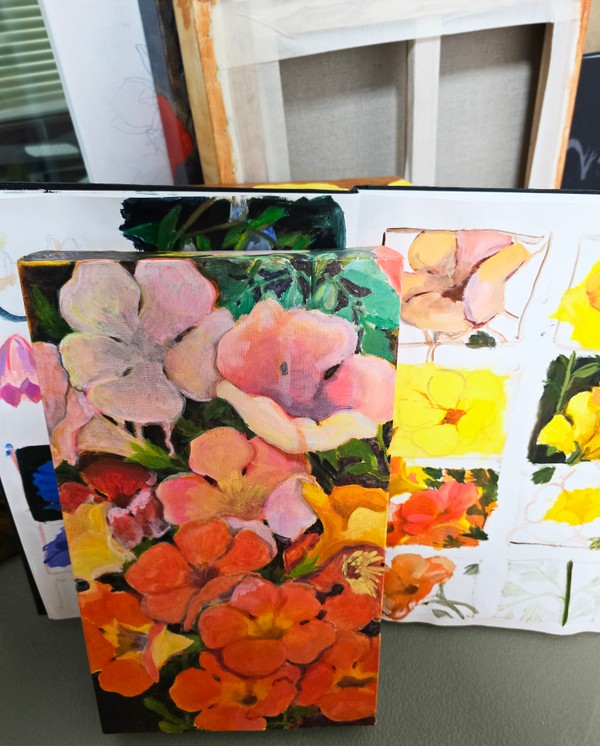 녹아, 핀 시리즈는 감정을 또다른 이름으로 가지고 있는 꽃들을 메인으로 사용하여 강한 감정의 변화와 이어짐에 대해 말하고 싶어서 기획한 시리즈입니다. 양초가 타면 모두 사라지는게 아니라 그 그을음과 촛농이 남듯, 강렬한 감정은 사라지는게 아니라 변화하고 중첩되어 또다른 감정으로 이어지니까요. 작년 어반브레이크 오픈콜 작가로 감사하게도 선정되었을 때 '감정피팅룸'이라는 VR 애니메이션 설치 작업과 함께 이 시리즈 몇개를 그때 처음으로 전시했습니다. 제가 연구하는 인간의 감정이라는 주제를 직접적으로 보여주기 가장 좋은 기획이라 생각했거든요. 저는 이 그림이 제일 좋네요 라는 감사한 피드백을 가장 많이 받았던 능소화의 꽃말은 그리움과 명예입니다.