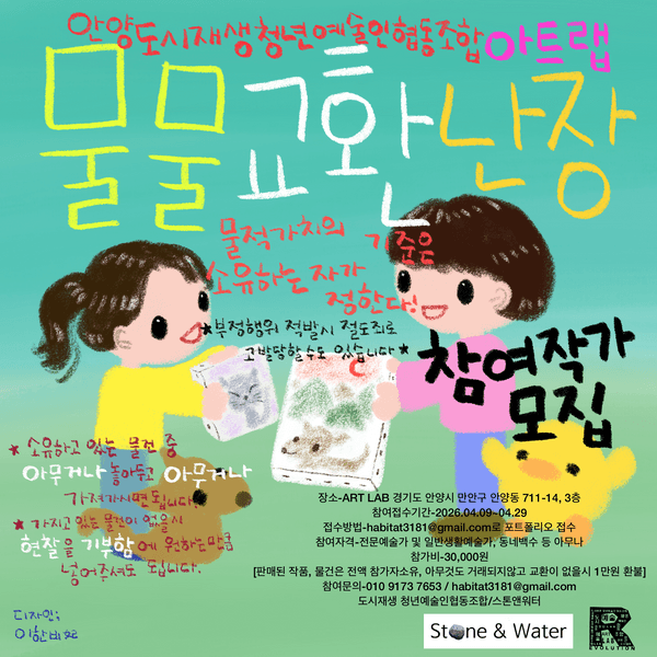 안녕하세요 작가님들 선생님들! 오픈스튜디오 미술관 안양중앙시장에 있는 아트랩에서 전시작가공모를 합니다. 작가님들의 숨겨진 작품을 함께 전시하고 물물교환 해보는 재미있는 전시예요. 저도 전시를 해봤지만 딸랑 전시만 하고 작품앞에서만 사진만찍고 작가들끼리 인사해볼수도 없는 전시를 많이 했었어요. 별 의미가 없는 프로필에 한줄 긋는 전시일뿐이었어요.하지만 이곳은 다릅니다! 서로 작품을 이야기하고 공감하며 공유할 수 있답니다. 많은 지원 부탁 드리며 좋은작품 기다리겠습니다. 장소 : ART LAB 경기도 안양시 만안구 안양동 711-14, 3층 참여접수 기간 : 2026.04.09. ~ 04. 28. 접수방법 : email _ habitat3181@gmail.com 참여자격 : 전문예술가 및 일반 생활예술가, 동네백수 등 아무나 참가비 : 3만원 (판매된 작품/물건은 전액 참가자 소유, 아무것도 거래되지 않고 교환이 없을시 1만원 환불) ‘우리는 물건을 바꾸는 것이 아니라, 서로의 삶을 나눈다. ‘교환’을 통해 만나고 새로운 관계와 가치를 만들어내는 문화예술 프로젝트 <물물교환> 프로젝트에서 물건을 교환할 때 그 물건에 담긴 개인의 기억, 감정, 사연을 함께 듣고 사연을 수집하는 역할을 한다. - 참여자는 서로 모르는 사람들 사이에서 교환이 이루어지도록 중간에서 이어주는 역할을 한다. - 돈이 아닌 방식으로 “이 물건은 어떤 가치가 있을까?”를 질문을 한다. - 교환을 제안하며 거래하는 행위자체를 예술로 만드는 역할을 한다. 참여문의 : 010-9173-7653 / habitat3181@gmail.com 도시제생 청년예술인협동조합 / 스톤앤워터 - 무인 물물교환 테이블 상시운영 - @ ART LAB (2026. 05. 01. ~ 05. 30. 13:00~ 21:00, 수 ~ 일요일), 관리인원(입주작가) 2명 상주 진행방법 1. ART LAB 또는 각자의 작업공간에서 작품 제작 후 전시 2. 기증받은 물건 또는 참여자가 교환 하고자하는 물건/작품을 테이블에 진열한다. 3. 원하는 물건이 있으면 참가자는 반드시 본인이 소지한 물건 / 전시한 작품을 두고 선택한 물건을 가져간다. (소지한 물건이 없을 경우 기부함에 양심껏 현찰을 넣는다.)* *계좌이체 가능 4. 우수고객(양심적인 거래자 / 특별한 사연이 있는 물건 거래자) 추첨 이벤트 진행 (매주 1회) _ 당첨자 소정의 상품 제공 ※ 야외 물물교환시장축제 1회 진행 : 5월 말 TBA ※ 교환, 판매작품 물건 소진시 추가 작품/물건 권장 ※ 작업공간 필요시 무료제공 @ 청년LAB (4월 20일~ 5월 30일, 13시~22시) #이한비작가 #위창완작가 #이한비화가 #이한비그림 #이한비 #아트랩 #안양미술관 #안양아트랩