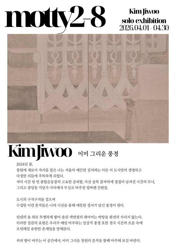 운영하고 있는 갤러리 겸 카페에서 전시중인 전시에대한 정보를 많은분들과 공유하고 싶어 올립니다🩷 우리의 시선으로 풍경을 담는 4월. 이달의 전시는, 아련하면서도 따스한 시선으로 바라본 창원의 풍경이 그려진 작품의 전시가 진행됩니다. [2026.04.01 - 2026.04.30] 이미 그리운 풍경_김지우 개인전 김지우 작가님 @jiwoo.drawing 2024년 봄, 창원에 새로이 자리를 잡은 나는 서울의 매끈한 질서와는 다른 이 도시만의 생경하고 다정한 리듬에 주목하게 되었다. 저녁 시간 텅 빈 종합운동장의 고요한 공허함, 마산 골목 끝자락에 겹겹이 남겨진 시간의 무늬, 그리고 중앙동 식당가 사이에서 무심코 마주친 빛바랜 간판들. 도시의 구석구석을 걸으며 수집한 이런 흔적들은 나의 시선을 통해 애틋한 정서가 담긴 풍경이 된다. 린넨의 올 위로 투명하게 쌓아 올린 색연필의 레이어는 바탕을 완전히 가리지 않는다. 이러한 질감의 표현은 우리가 매일 마주하는 일상적 풍경 또한 결국 시간의 흐름 속에 흐릿해질 유한한 존재임을 말해준다. 커피 향이 머무는 이 공간에서, 이미 그리운 창원의 흔적을 함께 마주해 보길 바란다. ----- 모티2-8 경남 창원시 마산회원구 내서읍 옥정2길 8 1층 https://naver.me/x0hBqXNZ