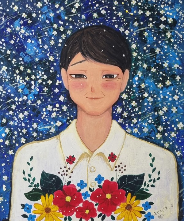 작품명:〈최선의 선택〉은 말할 수 있었지만 말하지 않았던 순간들이 남긴 감정의 상태를 담은 작품이다. 인물이 반쯤 물에 잠겨 있는 모습은 감정에 잠식된 상태가 아니라, 말이 되지 못한 감정을 안은 채 멈춰 서 있는 시간을 의미한다. 물 위에 떠 있거나 가라앉은 꽃들은 사라지지 않고 남아 있는 말들이며, 입과 가슴에 남은 붉은 온도와 얼굴과 목의 상처는 인간관계 속에서 말을 삼키며 스스로를 지켜온 흔적이다. 주변의 가로등은 감정과 무관하게 흘러간 시간과 일상을 암시하며, 이 장면은 놓쳤던 순간들조차 그때의 내가 선택할 수 있었던 하나의 방식이었음을 조용히 드러낸다. 〈The Best Choice〉 explores the emotional residue of moments when words could have been spoken but were consciously withheld. The figure, partially submerged in water, is not overwhelmed but suspended—holding unspoken emotions within. The flowers floating or sinking on the surface symbolize words that never vanished, only remained in another form. The red warmth in the mouth and chest, along with the marks on the face and neck, traces the quiet endurance of protecting oneself within relationships. The streetlights in the distance suggest time and daily life continuing regardless, leaving the scene as a calm acknowledgment that even the moments that seemed missed may have been the best choice one could make at the time. #아크릴화#현대미술#미술작가#art#drawing