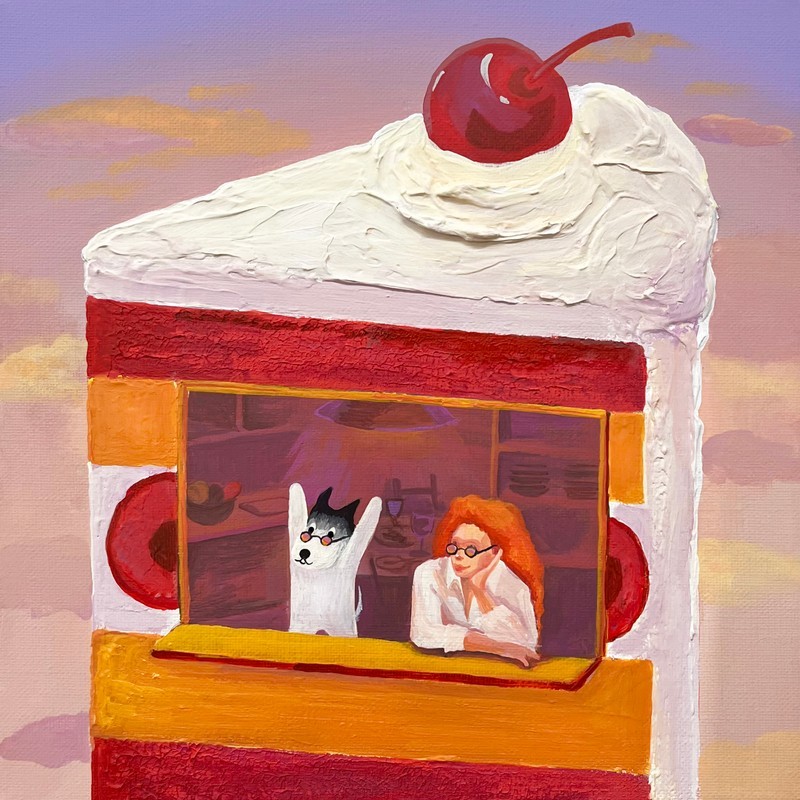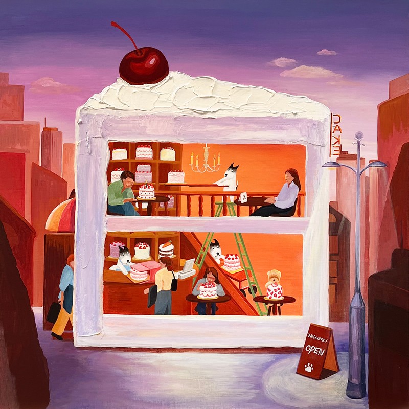 예를 들어 페인팅 작업에서 같은 ‘케이크’ 소재를 사용하더라도, ‘MY SWEET CITY’에서는 빌딩 숲처럼 빽빽한 구도로 도시 전체를 거시적으로 보여주고, 그 안을 생명체들로 활력 있게 채워 넣습니다. 반대로 ‘THE BLUE HOUR’에서는 케이크 집 한 채를 클로즈업해 쓸쓸하면서도 위트 있는 분위기와 어두운 채도를 강조하기도 해요.