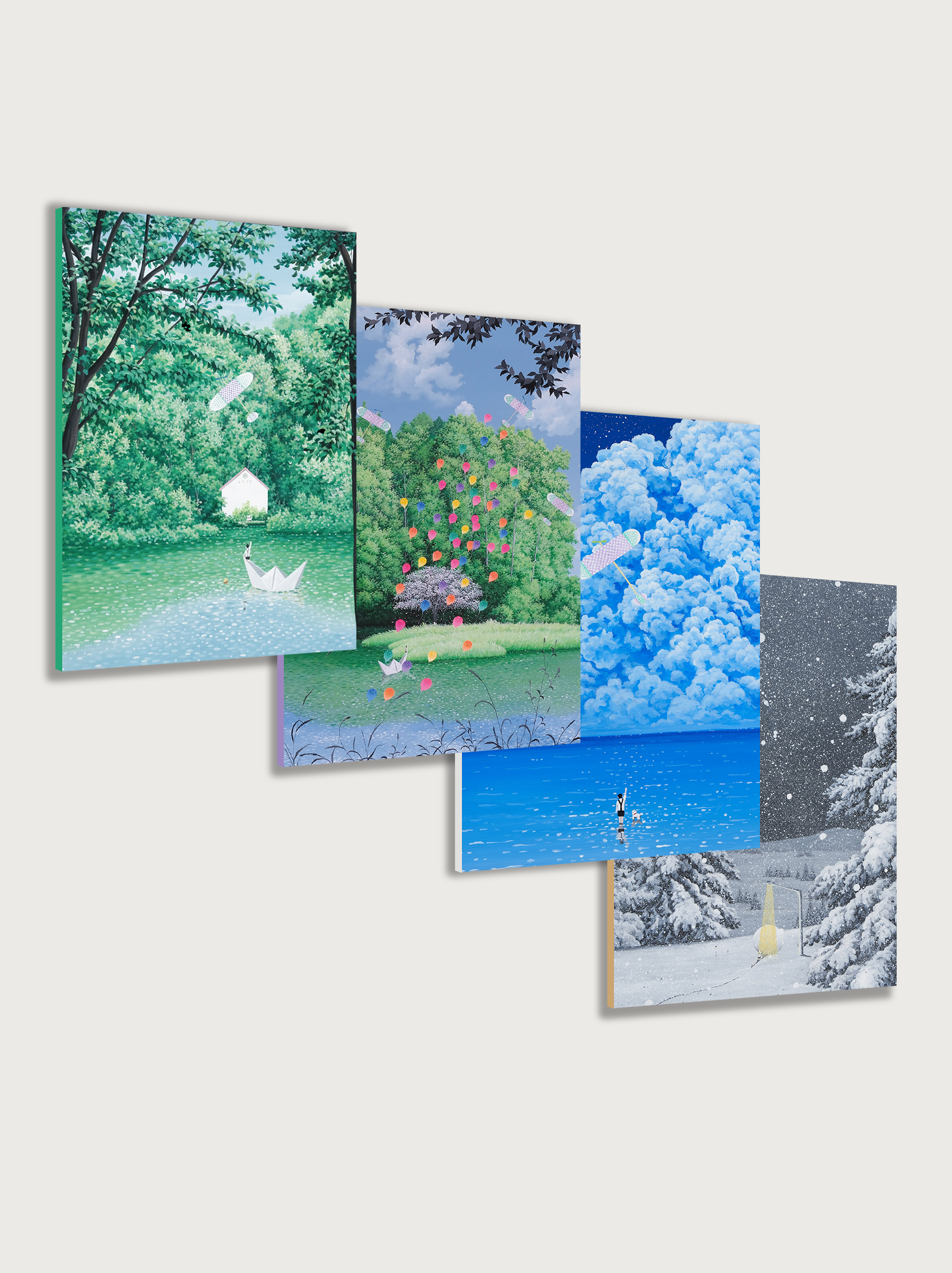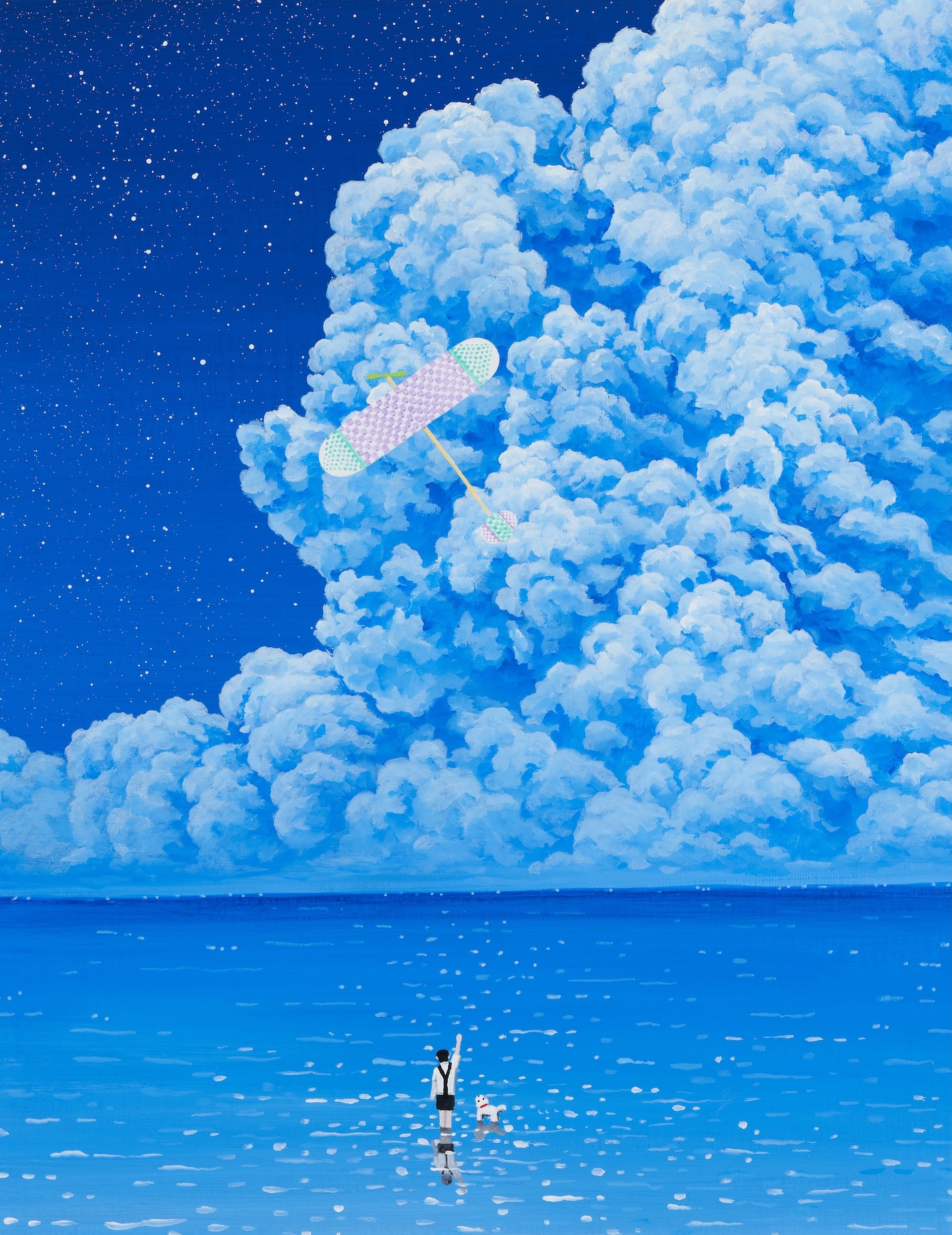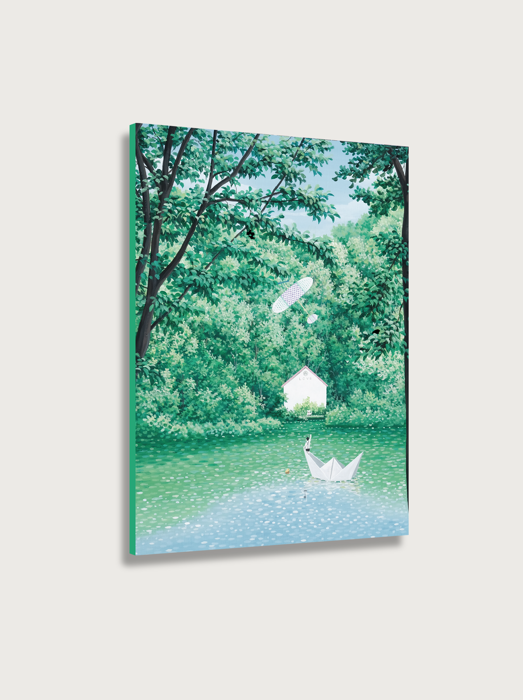 심봉민의 화면 속에는 늘 한 아이가 등장한다. 어린 시절의 ‘나’를 닮은 존재다. 아이는 하늘을 향해 글라이더를 날리고, 멀리 나아가길 바라는 마음으로 종이배를 띄운다. 숨바꼭질을 하고, 강아지 다롱이와 함께 시간을 보낸다.
