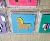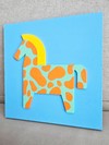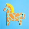 합성수지와 나무를 겹쳐 만든 말의 실루엣이 밝은 하늘색 배경에서 살짝 떠오르듯 분리되어, 작은 그림자를 드리우며 존재감을 드러낸다. 민트색 바탕 위에 유기적인 주황색 얼룩 패턴, 선명한 노란 갈기가 더해져 팝아트적이면서도 유년의 장난감을 소환하는 상징적 이미지로 완성된다.