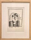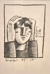 종이 위 색연필로 그려진 이 초상화는 두 손으로 머리를 감싼 인물을 단순화된 기하학적 형태와 농담 대비로 표현합니다. 절제된 선, 평면적인 얼굴, 강한 음영이 어우러져 조용하지만 압축된 심리적 긴장을 드러냅니다.