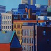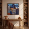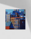 91.4cm 정방형 캔버스 안에 다양한 건축 양식의 입면과 지붕, 설비 구조물이 정교하게 맞물리며 도시의 밀도와 리듬을 드러냅니다. 짙은 블루와 오렌지·브라운 계열의 대비가 늦가을의 공기와 빛을 상징적으로 포착하며, 현대적이면서도 차분한 도시 추상성을 형성합니다.