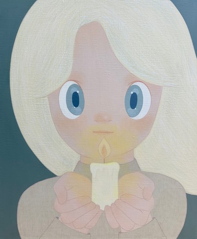 짙은 청록빛 배경 앞에 선 소녀는 화면의 거의 전부를 차지한 채, 커다란 파란 눈으로 조용히 관람자를 바라본다. 단순화된 얼굴과 몸, 팝아트적인 선과 면의 구성은 인물의 개성을 지우는 대신, ‘빛을 들고 있는 존재’라는 상징성에 집중하게 만든다. ...더보기