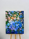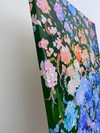 짙은 초록의 배경 위로 수국들이 화면 가득 피어오른다. 파랑과 보랏빛, 살구와 분홍이 뒤섞인 꽃송이들은 하나하나 따로 존재하면서도, 전체적으로는 하나의 큰 물결처럼 이어진다. 모델링 페이스트가 쌓아 올린 두꺼운 붓질은 꽃잎이 겹겹이 포개진 수국 특유의 볼륨을 살려내며,...see more