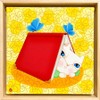 노란 꽃무늬 배경 위에 붉은 책을 텐트처럼 세워 두고, 그 아래에서 파란 눈의 고양이가 고개를 내민 장면을 담은 작품이다. 어린이·동물·책이라는 모티프를 통해 놀이와 상상력, 휴식의 시간을 경쾌한 색감으로 시각화한다.