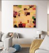 정사각형 화면 가득 따뜻한 크림빛이 번지며, 막 해가 떠오른 직후의 공기처럼 부드럽게 흔들린다. 그 위로 붉은색과 버건디, 올리브 그린, 짙은 네이비가 네모와 직사각형의 덩어리로 흩어져 있는데, 각기 다른 농도로 겹쳐진 색면들이 서로의 경계를 살짝 녹여 내며 한 호흡 ...see more