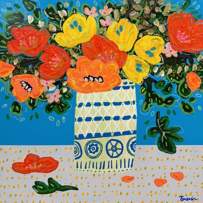 캔버스 위에 과슈, 오일 파스텔, 오일 스틱, 모델링 페이스트, 젤스톤을 복합적으로 사용해 두껍고 생동감 있는 꽃다발을 표현한 회화입니다. 화병과 테이블, 배경의 패턴과 색 대비를 통해 정물화이면서도 장식적이고 축제 같은 인상을 줍니다.