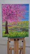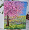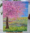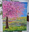 화면 오른쪽에서 곧게 자라난 나무는 짙은 갈색의 줄기를 단단히 세운 채, 머리 위로 거대한 분홍빛 왕관을 펼쳐 올리고 있습니다. 짧고 두툼하게 찍힌 아크릴 터치가 수없이 겹쳐지며 꽃잎과 잎사귀를 대신하고, 그 점과 선들이 모여 한 덩어리의 꽃구름을 만듭니다. 진분홍과 ...see more