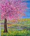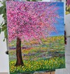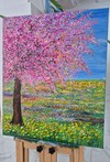 두텁게 쌓인 아크릴 터치로 구현된 분홍빛 나무와 노랑·연두의 꽃밭이 화면을 가득 채우며, 한 시절의 봄을 압축한 듯한 에너지를 발산한다. 거친 나무껍질과 꽃잎, 풀잎의 질감이 대비를 이루고, 수평으로 펼쳐진 블루 하늘이 숨 쉴 틈을 제공한다. 풍경은 특정 장소를 지시하기보다, ‘다시 돌아가고 싶은 날’에 대한 기억과 감정을 상징적으로 환기한다.