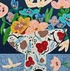 짙은 남색 배경 위에 놓인 화병은 하얀 몸체를 가득 채운 패턴 덕분에, 하나의 작은 정원처럼 보입니다. 빨강과 브라운, 하늘색으로 찍힌 꽃과 잎사귀의 문양이 먼저 눈에 들어오고, 그 위로 실제 꽃들이 겹쳐 피어나며 화면 안에 두 개의 꽃밭이 겹쳐집니다. 패턴과 실제 꽃...see more