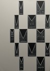 하얀 종이 위로 검은 직사각형들이 격자처럼 이어진다. 각 칸마다 삼각형의 귀와 두 개의 점, 한 줄의 입이 반복되지만, 같은 얼굴은 하나도 없다. 어떤 것은 길게 늘어나 창틀처럼 서 있고, 어떤 것은 작게 잘려 나가 구석에 걸려 있다. 색연필로 채워진 거친 검은 면과 ...see more