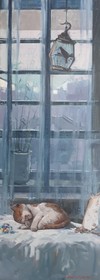 세로로 길게 뻗은 화면 안에 창틀, 유리, 화분이 겹겹이 배치되며 공간과 거리감을 만들어낸다. 절제된 색조와 흐릿한 외부 풍경은 사랑과 동물(고양이)의 존재를 직접 드러내기보다, 부재와 기다림의 정서로 우회해 표현한다.