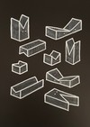 검은 바탕 위에 흩어져 있는 여러 개의 상자는 모두 같은 몸을 가진 서로 다른 순간처럼 보인다. 길게 누운 직육면체, 비스듬히 기대 앉은 형태, 세로로 곧게 선 기둥 같은 상자까지, 각기 다른 자세로 놓인 도형들 안에는 작은 두 개의 흰 점이 박혀 있다. 귀 대신 날카...see more