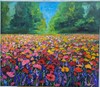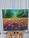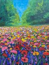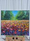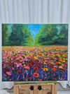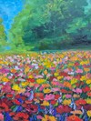 화면 앞쪽을 가득 메운 꽃밭은 붉은색과 분홍, 노랑과 주황, 그리고 짙은 보라가 서로 겹치며 하나의 거대한 색의 물결을 이룹니다. 짧고 두터운 아크릴 터치가 꽃잎과 줄기를 대신해 촘촘히 쌓여 있고, 각기 다른 방향으로 휘어진 붓질은 바람에 흔들리는 꽃의 몸짓처럼 살아 ...see more