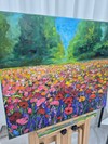 앞쪽의 붉은·분홍·노랑·주황·보라 꽃밭이 두터운 아크릴 터치로 밀도 있게 쌓여 있고, 뒤로 갈수록 색과 형태가 부드러운 안개처럼 섞이며 하나의 기억과 향기로 녹아듭니다. 수평선 위로는 짙은 초록 숲과 그 사이로 길게 열린 푸른 하늘의 통로가 대비를 이루며, 시선을 멀리 그리고 위로 이끄는 구조를 형성합니다. 특정 장소를 지시하지 않으면서도, 오래전 어느 날의 공기와 꽃향기를 환기시키는 ‘계절의 한 장면’으로 기능하는 작품입니다.