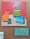 아크릴과 혼합재료로 구현된 평면적인 색면과 장난스러운 오브제 배열이 특징인 정물화다. 고양이, 화병, 기물들이 테이블 위에서 서로를 견제하듯 배치되며, 집이라는 공간의 온기와 고요한 긴장을 동시에 드러낸다.