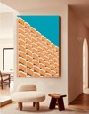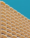 사선으로 잘려 나간 베이지색 발코니와 그 사이를 가르는 흰 선들이, 수직·사선 구조의 리듬을 따라 화면 전체에 벌집 같은 패턴을 형성한다. 강한 햇빛 아래 평평하게 눌린 색면과 청록색 하늘의 대비는 실제 건축의 무게를 지우고, 그래픽 이미지에 가까운 가벼운 시각 경험을 제안한다. 이 구조 속에서 관람자는 개별적 삶보다 군집이 공유하는 호흡과 도시의 집단적 리듬을 먼저 감지하게 된다.