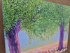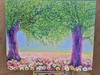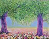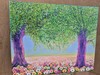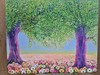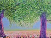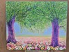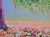 자줏빛 기운이 감도는 단단한 나무 기둥과 연두·초록·노랑 점들이 겹겹이 쌓인 풍성한 수관이 화면 중앙에 그늘의 아치를 만든다. 분홍·살구·레몬 옐로·화이트의 꽃밭은 두터운 아크릴 터치로 입체적인 ‘꽃 이불’을 이루며, 뒤로 갈수록 옅어지는 색은 들판과 하늘로 스며들듯 사라져 봄의 온도와 시간성을 암시한다.