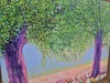 화면 양쪽을 가득 채운 두 그루의 나무가 서로를 향해 가지를 뻗으며, 가운데에 푸른 그늘의 아치를 만들고 있습니다. 굵고 자줏빛이 감도는 나 trunks는 단단한 기둥처럼 서 있고, 그 위로 수없이 찍힌 연두와 초록, 노랑의 점들이 겹겹이 쌓여 한 덩어리의 빛나는 잎사...see more