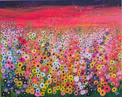 대형 30호 캔버스를 가득 채운 다채로운 꽃과 붉은 하늘의 대비가 강한 리듬감을 만들어내는 작품이다. 팝아트적 색채 감각과 상상적 풍경 구성이 어우러져, 자연 풍경을 감각적 이미지로 재해석한다.