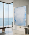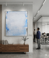 아크릴 레이어를 여러 번 쌓고 긁어내며 만들어진 반투명한 하늘색 필드는, 중앙의 넓은 여백과 화면 가장자리에 응축된 진한 블루·블랙의 농담 대비로 긴장감을 형성한다. 읽히지 않는 단어의 파편과 흔적 같은 선들은, 단호함과 주저함이 공존하는 심리적 순간을 시각화하며, 관람자가 자신의 속도대로 숨을 고르게 만드는 추상적 사유의 공간을 연다.