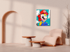 만화적 아이콘을 부분 확대하고 분절된 색면으로 재조립해, 캐릭터의 익숙함과 형식 실험의 낯섦이 공존하는 화면이다. 선명한 청록 배경과 원색의 대비가 그림 전체를 하나의 패턴처럼 읽히게 하며, ‘해체’라는 제목처럼 이미지 구조를 다시 보게 만든다.