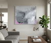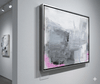 수평과 수직이 교차하지만 어디에도 단단한 경계가 없는 구조 속에서, 회색과 흰색의 레이어가 흐릿한 장면을 형성한다. 화면 하단의 형광 핑크와 검정, 옅은 보라·푸른 선이 눌려 있던 감정의 분출처럼 대비되며, 손의 궤적과 망설임 자체가 작품의 주제가 된다.