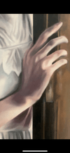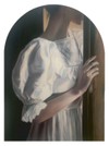부드러운 명암 대비와 절제된 색채로, 결혼식 직전의 고요하고 긴장된 공기를 담아낸 오일 초상화다. 아치형 화면과 문틀, 흰 드레스의 조합이 의식(儀式)과 문턱의 상징성을 강화하며, 부분 초상 구도가 인물의 감정에 집중하게 만든다.