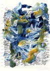 펜으로 적힌 과거의 기도문과 아크릴 물감의 굵은 제스처가 한 장의 종이 위에서 충돌하고 화해하는 작품입니다. 파랑·녹색·황색이 만들어내는 유동적인 패턴은 사랑과 기도의 감정을 동시에 떠올리게 하며, 시간 너머로 건네는 러브레터라는 작가의 의도를 시각적으로 구현합니다.