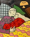 가족과 사랑이라는 주제를, 만화적 캐릭터와 대담한 패턴, 색의 대비로 구성한 회화다. 오일 특유의 두터운 질감과 평면적인 선 처리의 조합이, 포근한 침실 풍경을 그래픽적이면서도 감각적으로 전달한다.