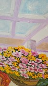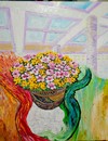 실내 사찰 구조 아래 중앙에 놓인 화려한 꽃바구니가 화면을 지배하며, 양옆으로 붉은색과 녹색의 흐름이 감정의 파동처럼 펼쳐진다. 두터운 물감층과 강렬한 색채 대비가 ‘봄’과 ‘쉼’이라는 제목을 물성 자체로 드러내는 회화다.