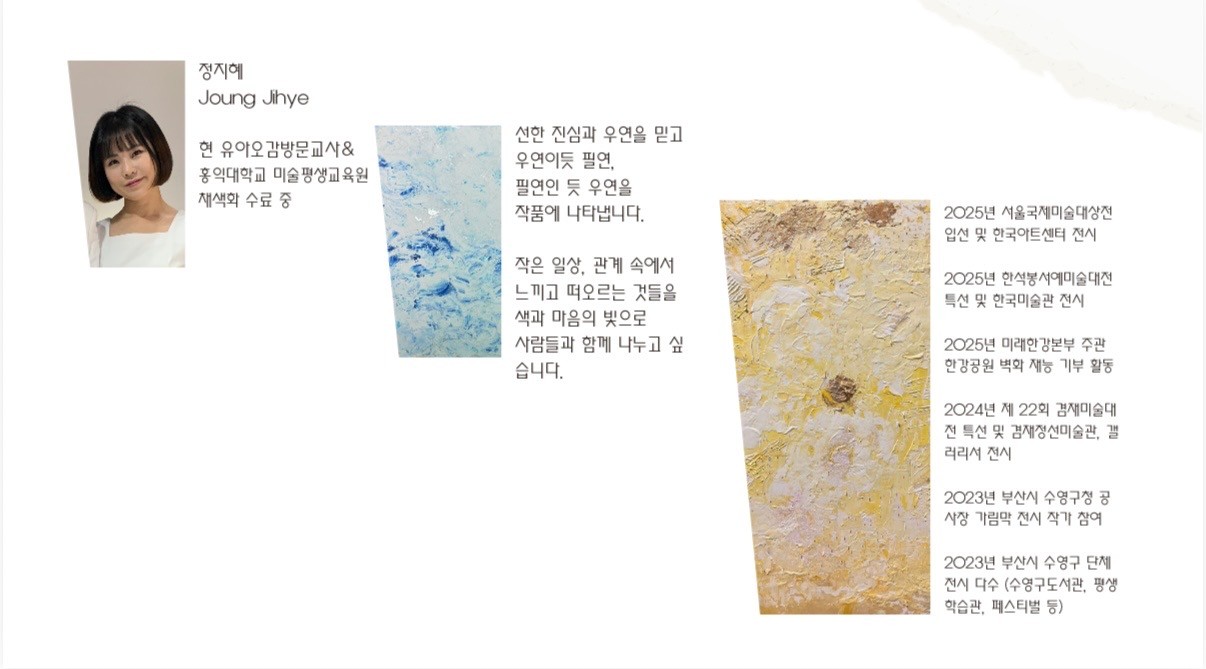 홍익대 미술평생교육원 채색화 수료 2025 대한민국회화대전, 서울국제미술대상전 입선 /한석봉서예미술대전 특선/한강공원 벽화 재능 기부 2024 겸재미술대전 특선 및 겸재정선미술관, 갤러리서 전시 2023 부산 수영구청 가림막, 도서관, 평생학습관, 축제 등 다수 전시