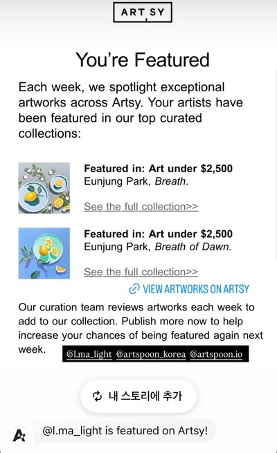 Artsy 컬렉션에 제 작품 <호흡>과 <새벽향기>가 선정되었습니다.☺️🩵 꾸준히 작업을 이어오던 중 이런 반가운 소식을 접하게 되어, 마치 따뜻한 응원을 받은 것처럼 느껴집니다. 앞으로도 저만의 시선과 균형을 잃지 않으며, 깊이 있는 작업을 차분히 이어가겠습니다. 🥰