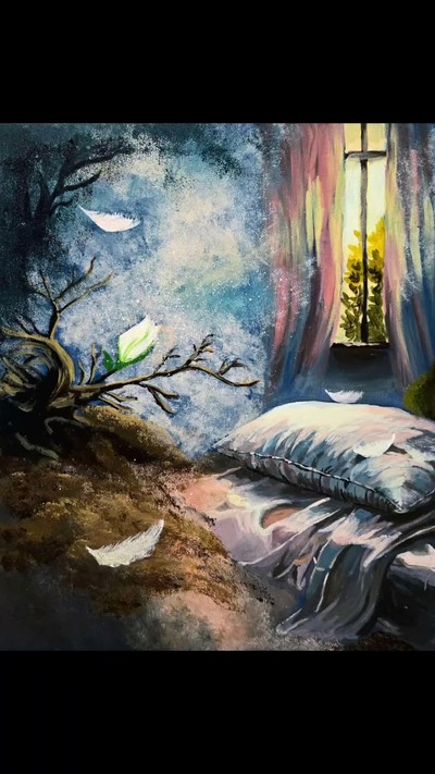작품 제목 〈잘자요〉이 작품은 잠들지 못한 밤과 이미 시작된 아침이 공존하는 경계의 순간을 담고 있다. 화면 중앙의 구겨진 배게와 침실 안으로 침범한 마른 나무가지는 쉬고 싶지만 쉽게 잠들지 못하는 불면의 상태를 상징하며, 가지 끝에 숨듯 맺힌 하얀 백합 봉오리는 아직 완전히 피지 않은 희망을 의미한다. 공중에 떠 있는 깃털들은 밤새 흩어진 생각과 불안을 시각화하고, 오른쪽에서 스며드는 새벽의 햇살은 모든 것을 해결하지 않은 채 공간만을 감싸며 ‘지금 잠들지 못해도 괜찮다’는 조용한 안심을 전한다. 이는 불면증을 극복한 결과가 아니라, 자지 못한 밤으로 인해 내일이 망가질 것이라 두려워하던 스스로에게 건네는 다정한 인사이며, 결국 햇살을 마주하는 어느 날에는 다시 잠들 수 있으리라는 믿음을 담은 〈잘자요〉이다. This work captures a liminal moment where a sleepless night and the arrival of morning coexist. The rumpled pillow at the center and the dry branches intruding into the bedroom symbolize the state of insomnia—longing for rest yet unable to sleep—while the white lily bud hidden at the tip of the branch represents hope that has not fully bloomed. Floating feathers visualize the scattered thoughts and anxiety of the night, and the dawn light seeping in from the right gently envelops the space without resolving everything, delivering a quiet reassurance: it is still okay even if sleep does not come. Rather than depicting recovery, the painting is a tender greeting to oneself, who feared that tomorrow would be ruined by another sleepless night, and it holds the belief that one day, under the warmth of sunlight, rest will finally arrive. This is Good Night—not as a request for sleep, but as a permission to oneself after enduring the night. #아크릴화#현대미술#미술작가#art#drawing