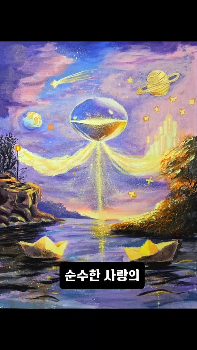 〈짝사랑〉은 서로를 향해 천천히 다가가지만 끝내 닿지 못한 두 개의 종이배와, 그 사이에서 흘러내리는 모래와 빛을 통해 말하지 못한 첫사랑의 기억과 시간의 잔상을 담아낸 작품이다. 종이배는 쉽게 젖고 구겨지는 연약한 마음을 상징하며, 모래는 다가가지 못한 채 흘러가 버린 시간을 의미한다. 물 위에 번지는 빛은 이미 끝난 감정이 완전히 사라지지 않고 기억으로 남아 다시 떠오르는 순간을 암시하며, 서로 다른 온도의 공간은 지나간 사랑과 우연히 다시 마주했을 때의 묘한 설렘을 동시에 보여준다. 이 작품은 짝사랑이 이루어지지 못한 실패가 아니라, 누구나 한 번쯤 품고 지나가는 가장 조용하고도 순수한 사랑의 형태임을 은유적으로 드러낸다. Unrequited Love portrays the lingering memory of a first love that could never be spoken, through two paper boats drifting slowly toward each other yet never touching, while sand and light flow between them. The fragile paper boats symbolize a delicate heart easily worn by emotion, and the falling sand represents the time that passed without courage to approach. The glow spreading across the water suggests feelings that did not disappear but remained as memories, resurfacing unexpectedly. The contrast between warm and cool spaces reflects both the past love that faded away and the quiet excitement of encountering it again by chance. Rather than a story of failure, the work reveals unrequited love as one of the most silent and pure forms of affection that everyone carries at least once in their life. #아크릴화#현대미술#미술작가#art#drawing