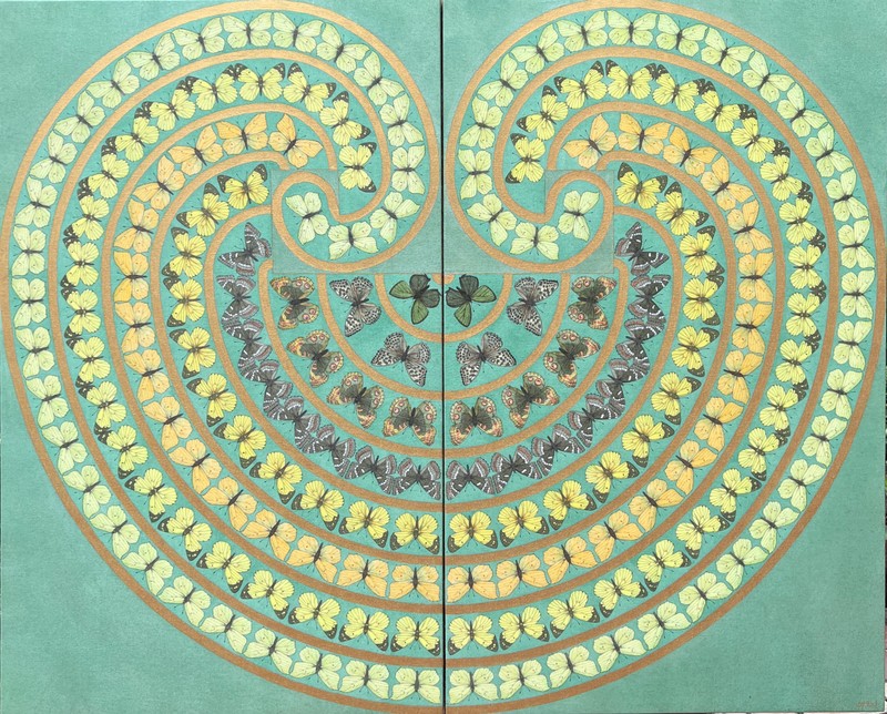 저는 나비, 토성, 성경에서 영감을 찾는 작가입니다. 저의 작업은 Hand in hand series, To Saturn series, The Bible series의 3가지 테마를 지니고 있습니다. 작업재료로는 광목천위에 한국화물감과 먹, 과슈, 축광을 사용합니다.